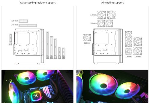 Podpora až 6 ventilátorů a vodního chlazení do 360 mm vpředu.