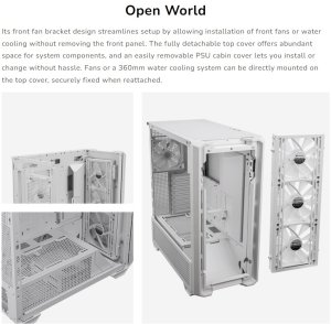 Its front fan bracket design streamlines setup by allowing installation of front fans or water cooling without removing the front panel. The fully detachable top cover offers abundant space for system components, and an easily removable PSU cabin cover lets you install or change without hassle. Fans or a 360mm water cooling system can be directly mounted on the top cover, securely fixed when reattached.