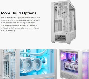 The MX600 RGB’s support for both vertical and horizontal GPU orientation gives you even more build options, with a GPU support bracket guaranteeing stability. (A Vertical GPU Kit is included for full functionality and convenience at no extra cost.)