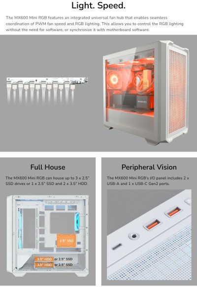 The MX600 Mini RGB features an integrated universal fan hub that enables seamless coordination of PWM fan speed and RGB lighting. This allows you to control the RGB lighting without the need for software, or synchronize it with motherboard software.