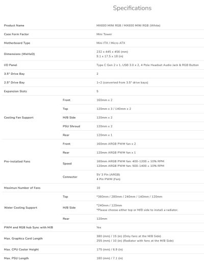 The MX600 Mini RGB pioneers the integration of twin 160mm fans within a mini tower, compacting their formidable cooling power into a small, space-efficient package. Gaining reverse connector motherboard compatibility and expanded fan capacity of 10, it also inherits the full ventilation, strategic filtering, and top 360mm water cooling option of its mid-tower predecessor.