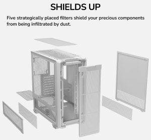 Five strategically placed filters shield your precious components from being infiltrated by dust. The quick-slide front filter in particular can be accessed without removing the front panel, minimizing contact with airborne particles during maintenance. From the bottom to the top, from the sides to the front, the comprehensive filtration ensures your hardware remains pristine, reducing maintenance and prolonging the lifespan of your PC.