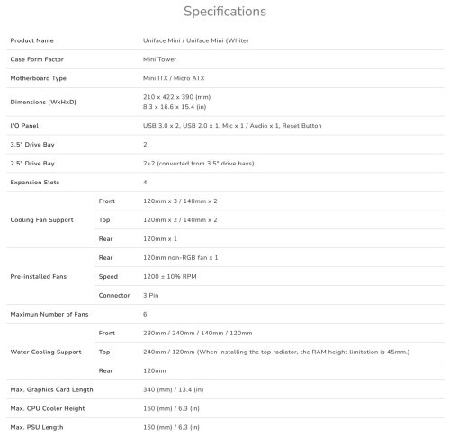 Klamavě kompaktní uspořádání skříně Uniface Mini umožňuje instalaci šesti ventilátorů a volbu mezi 280mm chladičem vodního chlazení a 160mm chladičem procesoru. Tento obrovský chladicí potenciál vám umožní postavit si sestavu snů bez obav z přehřívání komponent.