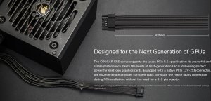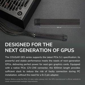 Řada COUGAR GES je navržena tak, aby podporovala systémy nové generace, a splňuje standard ATX 3.1. Díky nativnímu provedení 12V-2X6 poskytuje napájení grafickým kartám nové generace prostřednictvím jediného kabelu 12+4-pin. Díky oběma stupňům účinnosti 80 PLUS Gold nabízí vysoce kvalitní stabilitu, odolnost a spolehlivost.