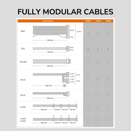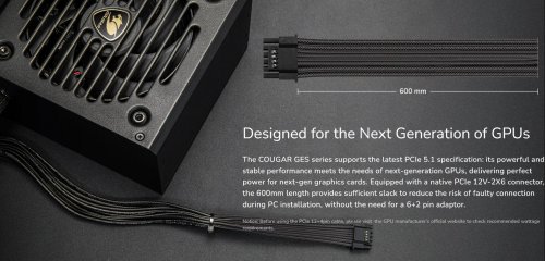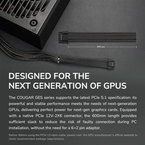 Řada COUGAR GES podporuje nejnovější specifikaci PCIe 5.1: její silný a stabilní výkon odpovídá potřebám grafických procesorů nové generace a poskytuje dokonalý výkon pro grafické karty nové generace. Je vybavena nativním konektorem PCIe 12V-2X6 a díky délce 600 mm poskytuje dostatečnou vůli, která snižuje riziko chybného připojení při instalaci počítače, aniž by bylo nutné používat adaptér 6+2 pinů.