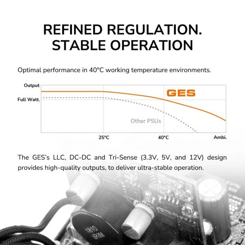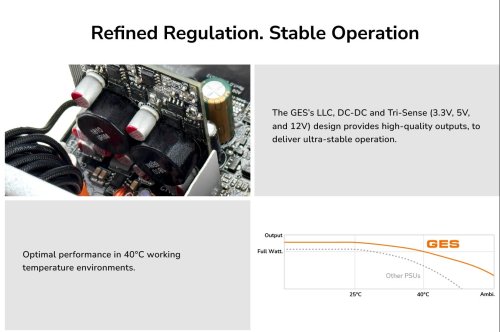 Konstrukce GES LLC, DC-DC a Tri-Sense (3,3 V, 5 V a 12 V) poskytuje vysoce kvalitní výstupy a zajišťuje mimořádně stabilní provoz.