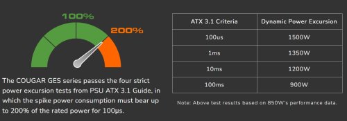 Řada COUGAR GES prošla čtyřmi přísnými testy výkyvů napájení podle příručky PSU ATX 3.1, při kterých musí spotřeba energie při výkyvu vydržet až 200 % jmenovitého výkonu po dobu 100 µs.
