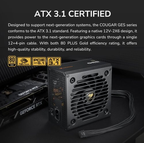 Řada COUGAR GES je navržena tak, aby podporovala systémy nové generace, a splňuje standard ATX 3.1. Díky nativnímu provedení 12V-2X6 poskytuje napájení grafickým kartám nové generace prostřednictvím jediného kabelu 12+4-pin. Díky oběma stupňům účinnosti 80 PLUS Gold nabízí vysoce kvalitní stabilitu, odolnost a spolehlivost.