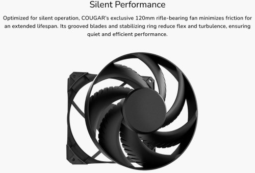Exkluzivní 120mm ventilátor COUGAR s puškovým ložiskem, optimalizovaný pro tichý provoz, minimalizuje tření a prodlužuje životnost. Jeho drážkované lopatky a stabilizační kroužek snižují ohyb a turbulence a zajišťují tichý a efektivní výkon.