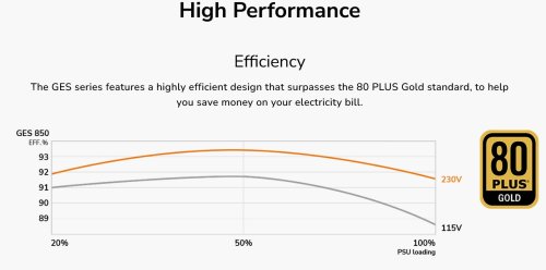 Řada GES se vyznačuje vysoce účinnou konstrukcí, která překračuje standard 80 PLUS Gold, aby vám pomohla ušetřit peníze za elektřinu.
