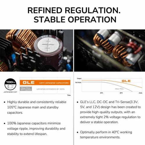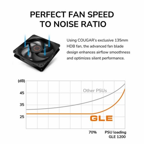 The COUGAR GLE series boasts high-quality 80 PLUS Gold certification, achieving up to 91% conversion efficiency. Utilizing a native PCIe 12V-2X6 connector design, this power supply delivers power to next-gen graphics cards through a single 12+4-pin cable, bringing them into compliance with Intel’s ATX 3.1 standard. With flawless power delivery in 40°C environments, it saves energy, reduces electricity costs, and provides stable power to all components.