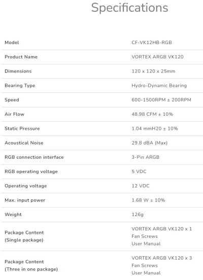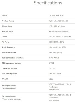 COUGAR VORTEX VK120 high-performance cooling fan provides various and colorful ARGB lighting effects for your chassis. Moreover, it improves the cooling effect efficiently. It’s absolutely an indispensable part of ARGB gaming PC system.
