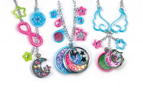 Exkluzivní sada pro vytváření náramků a náhrdelníků s fantastickými kouzly Crazy Stars a Crazy Moon, které svítí ve tmě! Sada obsahuje: hliníkové náhrdelníky a prsteny, přívěsky z kovového a barevného plastu ve tvaru měsíce a hvězd, holografické nálepky a držák na doplňky. Zábavná a kreativní hračka pro vytváření trendových doplňků! Rozměry balení: 18 x 18 x 6 cm. Věk: 7+