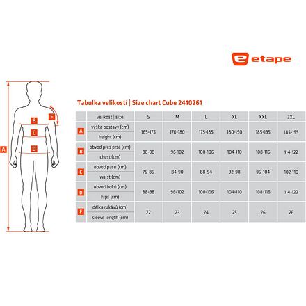 Pánský cyklistický dres Etape Cube ocení každý cyklista, ať už na kole jezdí pravidelně či rekreačně. Dres s krátkým rukávem je vyrobený z elastického materiálu MicroCool – funkční elastický materiál z polyesterových mikro vláken, který velice rychle schne, odvádí pot a vlhkost od pokožky. Dres dále nabízí dlouhý přední zip a 3 zadní kapsy pro uložení drobností. Díky použitým reflexním prvkům budete na cestě vždy dobře viděn. Velikostní tabulka v obrázcích. Uvedené hodnoty jsou pouze orientační a vhodná velikost se může lišit dle konkrétního typu postavy.