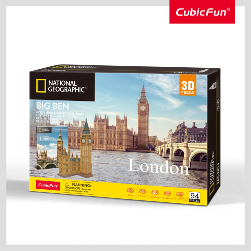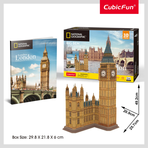 Jedinečný 3D model slavné dominanty anglického Londýna. 3D puzzle - stavebnice ze série National Geographic od CubicFun vyrobená ze speciálního materiálu - asi 3mm silné pěny potažené laminovaným potištěným papírem. Součástí balení je cestovní průvodce po Londýně v angličtině. Sestavování 3D puzzle Cubicfun je zábavou pro celou rodinu. Hotové modely mohou být sběratelským a dekorativním doplňkem bytu nebo dětského pokoje. Dílky se k sobě sestavují pomocí návodu bez použití lepidla a nůžek - předražené dílky pouze jednoduše vylomíte z archu. Orientační čas na sestavení: 120 - 220 minut Big Ben je hovorové označení používané pro hodinovou věž která je součástí budovy Westminsterského paláce vedle Temže v Londýně a neformální pojmenování Velkého zvonu. Věž se tyčí nad severovýchodní straně paláce, ve kterém zasedá parlament. Více na Wikipedii Rozměr složeného puzzle cca 25,7 x 20,9 x 49,2 cm