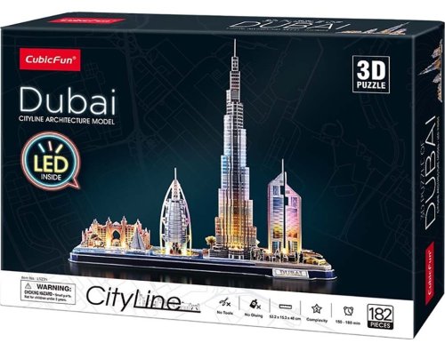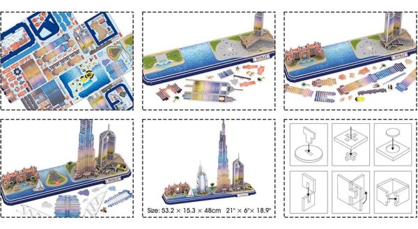 Okouzlující svítící 3D panorama Dubaje. 3D puzzle - stavebnice ze série CityLine od CubicFun vyrobená ze speciálního materiálu - asi 3mm silné pěny potažené laminovaným potištěným papírem. Sestavování 3D puzzle Cubicfun je zábavou pro celou rodinu. Hotové modely mohou být sběratelským a dekorativním doplňkem bytu nebo dětského pokoje. Dílky se k sobě sestavují pomocí návodu bez použití lepidla a nůžek - předražené dílky pouze jednoduše vylomíte z archu. Rozměry složeného modelu: 53,2 x 15,3 x 48 cm. Orientační čas na sestavení: 150 - 180 minut. Rozměr složeného puzzle cca 53,2 x 15,3 x 48 cm
