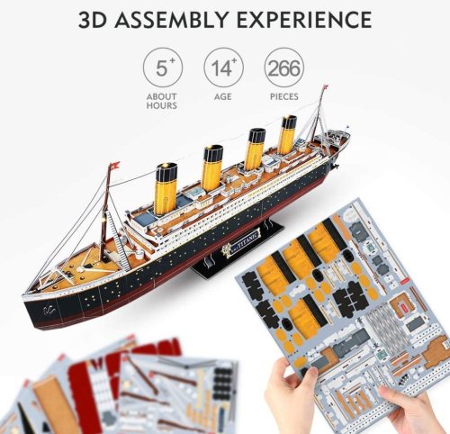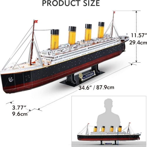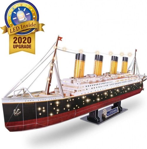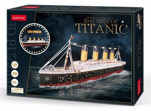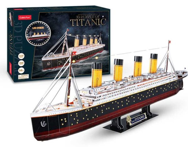 Úchvatný 3D model slavného parníku s LED osvětlením! Titanic je potopený zaoceánský parník třídy Olympic patřící společnosti White Star Line. Ve své době šlo o největší parník světa. Byl určen pro převoz cestujících a pošty mezi Evropou a Severní Amerikou. 3D puzzle - stavebnice s LED osvětlením od CubicFun vyrobená ze speciálního materiálu - asi 3 mm silné pěny potažené laminovaným potištěným papírem. Sestavování 3D puzzle Cubicfun je zábavou pro celou rodinu. Hotové modely mohou být sběratelským a dekorativním doplňkem bytu nebo dětského pokoje. Dílky se k sobě sestavují pomocí návodu bez použití lepidla a nůžek - předražené dílky pouze jednoduše vylomíte z archu. Obtížnost 8,9 Orientační čas na sestavení: cca 4 hodiny Rozměr složeného puzzle cca 87,9 x 29,4 x 9,6 cm