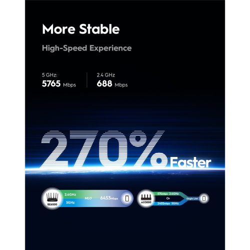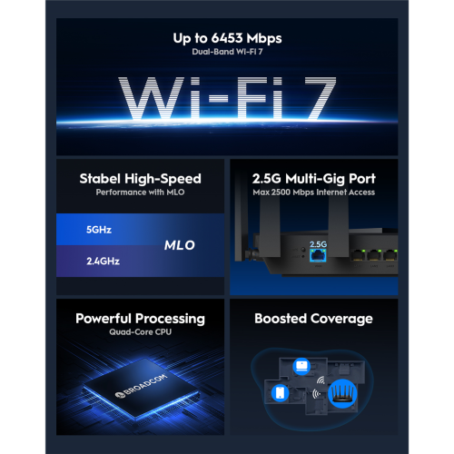 • podpora IEEE 802.11be (Wi-Fi 7) ve dvou pásmech se 6 streamy a celkovou přenosovou rychlostí až 6453 Mb/s