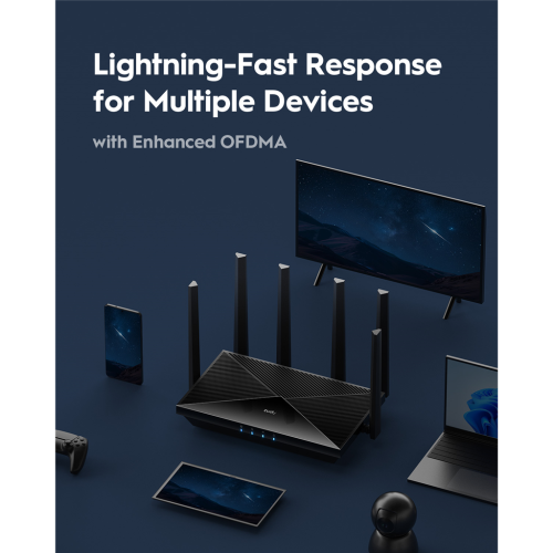 • vysoká přenosová kapacita a nízká latence díky podpoře 160MHz pásma a technologiím MRU/OFDMA (efektivnější přenos) a MU-MIMO (přenos více kanály současně)