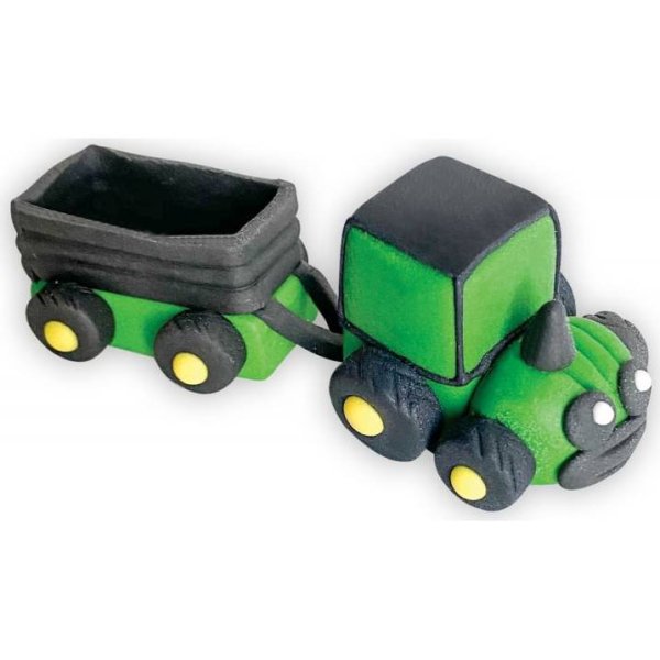 Cukrová figurka traktor s vozíkem. Rozměry 5 x 7 cm.