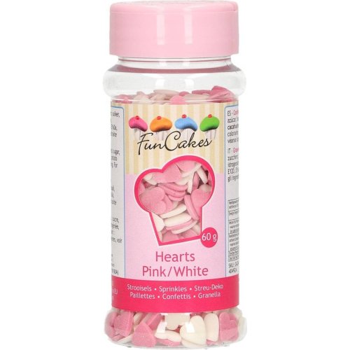 Jedlá dekorativní bílo růžová srdíčka pro zdobení dortů. Balení 60 g.