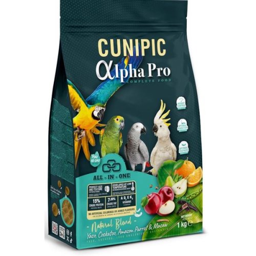 Cunipic Alpha Pro Natural Blend je kompletní a vyvážené přírodní krmivo pro velké papoušky (např. žako, kakadu, amazoňan nebo ara). Díky koncepci „All in One“ obsahuje každá granule všechny důležité živiny, takže papoušek nemůže vybírat jen to, co mu chutná. Nízkoteplotní zpracování uchovává živiny a zajišťuje krmivu maximální výživovou hodnotu. Krmivo podporuje trávení, vitalitu a zdraví kostí i srdce, neobsahuje přidané cukry ani umělá barviva a přispívá k dlouhému a zdravému životu. Díky nízkému obsahu tuku je vhodné i pro papoušky s tendencí k nadváze. Balení v ochranné atmosféře zajišťuje čerstvost až do posledního sousta. Hlavní přednosti: