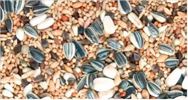 Lesklice kanárská, žluté proso, pšenice, žíhaná slunečnice, nahý oves, bílé proso, loupané proso, světlice barvířská, bílá slunečnice, pohanka, červené proso, čirok, lněné semínko, neloupaná rýže, grit z mořských mušlí, žaludeční kamínky, pomerančové aroma, vitamíny.