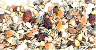 Žíhaná slunečnice, světlice barvířská, neloupaná rýže, pohanka, oves, kukuřice, žluté proso, bílá slunečnice, sója mungo, lesklice kanárská, arašídy (se slupkou), ječmen, nahý oves, rýže, extrudované peletky, šípky, konopné semínko, cedrové oříšky, grit z mořských mušlí, dýňová semena, svatojánský chléb, rozinky, hrachové vločky, pufovaná kukuřice, žaludeční kamínky, pomerančové aroma, vitamíny.