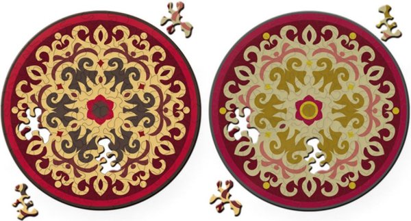 dva motivy v jednom puzzle = dvojnásobná výzva, neobvyklé tvary dílků, vysoce kvalitní dřevěné dílky, pevná krabička s kovovým víčkem, ideální jako dárek.