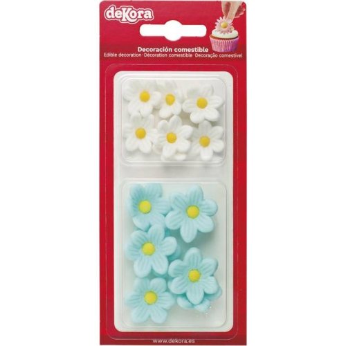 Cukrová dekorace obsahuje 7 bílých a 7 modrých kopretin.