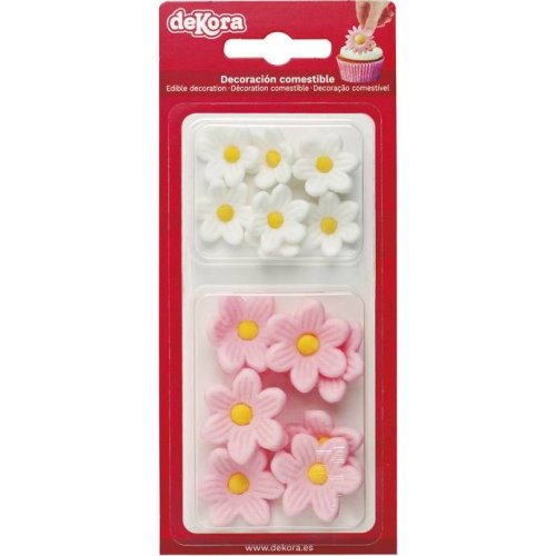 Cukrová dekorace obsahuje 7 bílých a 7 růžových kopretin.