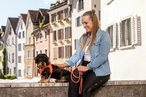Vodítko a postroj lze připnout jednou rukou pomocí přezky. Vysoce pevný materiál přezky, který vydrží tahové zatížení až 100 kg. Tato přezka eliminuje "cvakání" kroužků typu D. Výrazně vylepšená ergonomie postroje a optimalizovaný střih díky novému designu a nové velikostní stupnici. Postroj je vyroben z lehkého materiálu Air-Mesh spony pro pohodlné nošení. Velikost postroje lze nastavit pomocí suchého zipu. Postroj je vyroben tak, aby bylo optimálně rozloženo napětí a nedošlo k poranění krku. Polstrovaná přezka zajišťuje, že se srst nezachytí ani nepodráždí.