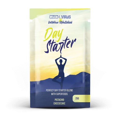 Day Starter je komplexní produkt ve stylu Smoothie s obsahem superpotravin pro ten nejlepší start dne. Základ tvoří kvalitní hrachový izolát a celozrnná ovesná mouka pro jednoduché a lehce stravitelné doplnění makroživin po nočním půstu. Obsahuje přírodní kofein z guarany a zeleného čaje pro postupné a příjemné nakopnutí bez nežádoucího dojezdu. Dále také kombinaci citrulinu s červenou řepou pro prokrvení. Směs je obohacena o naši skvělou zelenou směs, kterou znáte z best-selleru Super Greens PRO V2.0 (spirulina, chlorela, mladý ječmen a mladá pšenice) včetně V-AntiOxi-Blend® (směs antioxidantů), V-Shrooms-Blend® (směs hub) a V-Dige-Blend® (směs trávících enzymů). Kvalitní živiny Day Starter obsahuje kvalitní a lehce stravitelné makroživiny. Protein zastupuje izolát z hrachového proteinu (Pisane®), který má podle in vivo studií perfektní využitelnost, sacharidy potom v menší míře celozrnná ovesná mouka. Samozřejmostí je minimum cukrů (bez přidaných cukrů), aby produkt neměl negativní vliv na hladinu cukru v krvi. Dále také obsahuje slušné množství vlákniny, která v mnoha jídelníčcích stále chybí. Dávkování produktu lze individuálně upravit podle nároků vašeho jídelníčku a vašich cílů. Směs pro ranní boost Day Starter obsahuje pečlivě vybrané ingredience, které pomohou tělu s jednodušším nastartováním bez nežádoucích účinků. Základem je směs na prokrvení, kterou zastupuje L-Citrulin a Sabeet® (extrakt z červené řepy). Dále produkt obsahuje směs přírodního kofeinu ze dvou zdrojů - guarany a zeleného čaje. Tato směs dodá tělu lehké nakopnutí bez nežádoucího crashe. Jedna dávka produktu obsahuje 67 mg kofeinu, což je zhruba jedno espresso. Další látky a blendy Day Starter obsahuje látky, které můžete znát ze Super Greens (nicméně není dobré produkt zaměňovat, každý má jiné zaměření!). Obsahuje zelené superpotraviny (spirulina, chlorela atd.), dále také naše blendy: V-AntiOxi-Blend® (směs antioxidantů), V-Shrooms-Blend® (směs hub) a V-Dige-Blend® (směs trávících enzymů). Pro podporu normální funkce imunitního systému je zde přidán také Vitamín C. Textura a chuť Day Starter svou texturou připomíná smoothie, tedy hustší drink a stejně jako domácí smoothie nabízí velké množství benefitů s výhodou extrémně rychlé přípravy. Stačí použít shaker a vodu, není nutné používat mixér nebo špinit další nádobí. Chuť jsme vyladili do velice příjemného a vyváženého chuťového profilu, který potěší většinu uživatelů. Chuť je jemná a přírodní. Pro koho je produkt určen Day Starter je designován pro uživatele, kteří před fyzickou aktivitou nemají rádi hutná jídla, ale zároveň jim nevyhovuje být úplně na lačno. Pro lidi, kteří chtějí po nočním půstu tělu dodat okamžitě a lehce využitelné látky pro příjemné probuzení a nakopnutí. Produkt může svým zaměřením sloužit jak lidem z fitness, tak třeba běžcům. Slouží také pro vytížené lidi, kteří nestíhají před prací/školou chystat pracně vlastní smoothie a chtějí mít co nejdříve připraven chutný a výživný nápoj. Náš produkt ale v žádném případě plně nenahrazuje jídlo, slouží jako doplněk k jídelníčku. Doporučené dávkování: