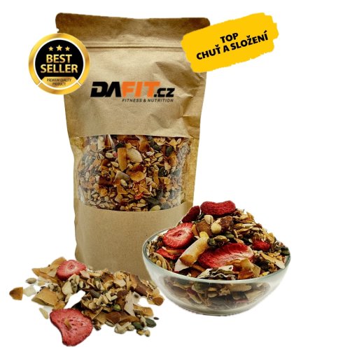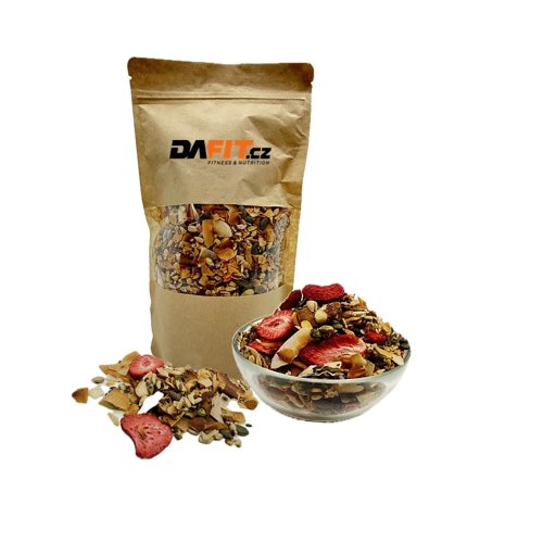 Sůl 0,40 g Složení: Směs olejnatých semen v různém poměru 35 % (semena slunečnice loupená, semena tykev loupaná, lněná semínka, chia semínka (Salvia Hispanica)), kokosové chipsy, jádra mandlí, čekankový sirup, jahody sušené mrazem, jedlá sůl. Upozornění pro alergiky: obsahuje mandle. Může obsahovat stopy ostatních skořápkových plodů. Země původu: ČR Upozornění: Uchvávejte při teplotě do 25 °C, v suchu a nevystavujte přímému slunečnímu záření. Po otevření spotřebujte do 14 dnů.