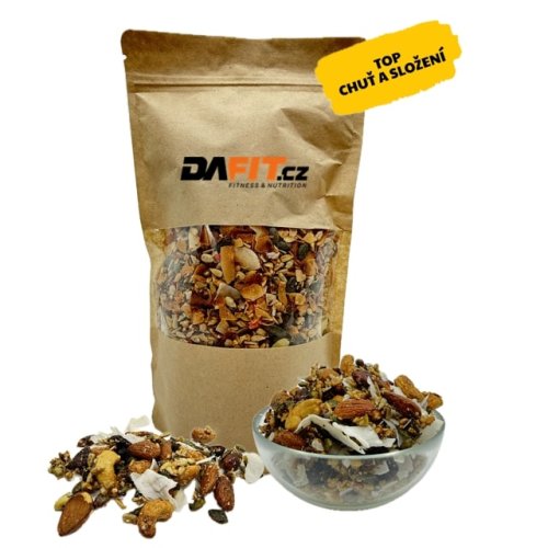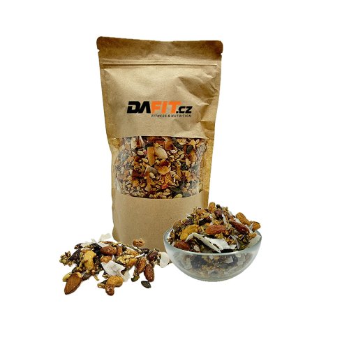 Sůl 0 g Složení: Směs olejnatých semen v různém poměru 35 % (semena slunečnice loupená, semena tykev loupaná, konopná semínka loupaná), směs ořechových jader v různém poměru 20 % (jádra mandlí, jádra kešu), kokosové chipsy, sušené brusinky (brusinky, jablečný sirup), med, kokosový olej. Upozornění pro alergiky: obsahuje mandle a kešu. Může obsahovat stopy ostatních skořápkových plodů. Země původu: ČR Upozornění: Uchvávejte při teplotě do 25 °C, v suchu a nevystavujte přímému slunečnímu záření. Po otevření spotřebujte do 14 dnů.