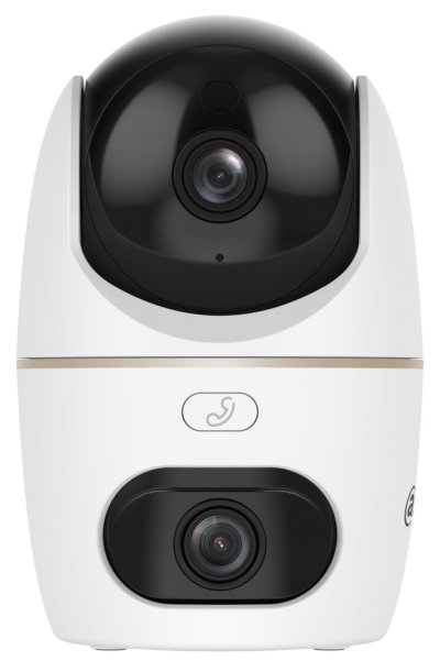 Vnitřní duální IP síťová kamera typu Cube s Wi-Fi, dvěma 5Mpx snímači, rozlišením 2× 2880 × 1620 px, kompresí videa H.265, mikrofonem a reproduktorem.