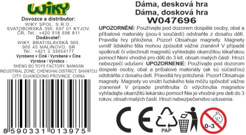 Dáma desková hra. Rozměry krabičky 20x3x10 cm. Figurky a hrací deska jsou magnetické.