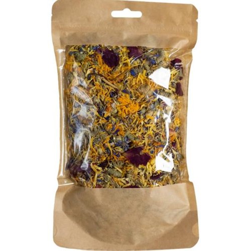 Sušená bylinná směs je vhodným doplňkem stravy pro králíky a hlodavce. Bylinky pocházejí z českých luk. Kvalitu každého balení zaručuje ruční plnění. Měsíček lékařský je jedna z nejoblíbenějších pochutin všech králíků, má zklidňující účinky, mírní žaludeční křeče a uvolňuje svalové křeče. Má protizánětlivé účinky, napomáhá správné činnosti srdce a jen málokterý králík mu odolá. Okvětní lístky růže jsou oblíbenou pochoutkou pro králíky a hlodavce. Zmírňují stres a zlepšují krevní oběh. Krásně provoní seno. Levandule svým aromatem zklidňuje stresované králíky. Chrpa je velmi oblíbenou přírodní pochoutkou pro králíky i hlodavce. Působí protiinfekčně, detoxikačně, čistí játra a pozitivně působí při onemocněních močových cest. Složení: měsíček lékařský 25 %, růže okvětní lístky 25 %, levandule květ 25 %, chrpa květ 25 %. Krmný návod: Přidávejte denně ke krmné dávce nebo volně jako pamlsek. Množství přizpůsobte druhu, věku a zdravotnímu stavu zvířete. Zvířeti zajistěte nepřetržitý přístup k čerstvé pitné vodě.