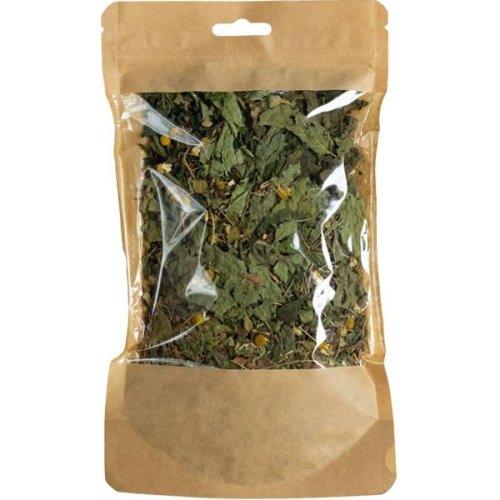 Sušená bylinná směs je vhodným doplňkem stravy pro králíky a hlodavce. Bylinky pocházejí z českých luk. Kvalitu každého balení zaručuje ruční plnění. Listy máty peprné podporují prokrvení a tvorbu žluči, dezinfikují ústní dutinu, zmírňují bolesti a jsou vhodné pro podporu trávení. Meduňka působí proti křečím a má pozitivní vliv na trávicí ústrojí. Může pomoct i při nadýmání a neklidu. Heřmánek působí pozitivně při onemocněních dýchacích cest i při potížích se zažíváním. Působí protizánětlivě a desinfekčně, uvolňuje křeče. Listy borůvek mohou pomáhat se snížením hladiny cukru v těle a také při zažívacích a průjmových potížích. Bazalka podporuje chuť k jídlu, tiší křeče a zklidňuje. Používá se také při nechutenství, kdy je nutné , aby mazlíček začal jíst. Anýz podporuje trávení. Kopřiva obsahuje velké množství vitamínů a minerálních látek pro podporu imunity a správného zažívání. Složení: máta peprná 20 %, meduňka 20 %, heřmánek 5 %, anýz 5 %, borůvka 25 %, bazalka 5 %, kopřiva list 20 %. Krmný návod: Přidávejte denně ke krmné dávce nebo volně jako pamlsek. Množství přizpůsobte druhu, věku a zdravotnímu stavu zvířete. Zvířeti zajistěte nepřetržitý přístup k čerstvé pitné vodě.