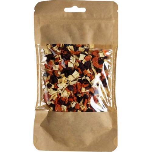 Sušené lahodné kostičky zeleniny pro králíky a hlodavce jsou pestrým doplňkem stravy plným vůní a přírodních chutí. Kvalitu každého balení zaručuje ruční plnění. Složení: řepa 25 %, celer 25 %, petržel 25 %, mrkev 25 %. Krmný návod: Přidávejte denně ke krmné dávce nebo volně jako pamlsek. Množství přizpůsobte druhu, věku a zdravotnímu stavu zvířete. Zvířeti zajistěte nepřetržitý přístup k čerstvé pitné vodě.