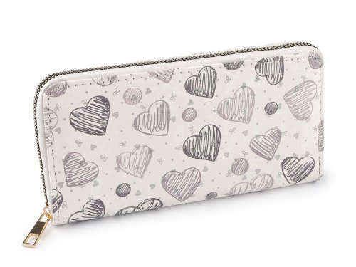 Peněženka s potiskem srdíček je elegantním a stylovým doplňkem. Upoutá pozornost i díky svému třpytu, který způsobují malá metalická srdíčka a mašličky v potisku. Peněženka obsahuje jednu hlavní kapsu, která se zapíná na kovový zip. Uvnitř je peněženka členěná do tří velkých přihrádek na papírové bankovky a jedné uzavíratelné kapsy na zip, vhodné k ukládání mincí a různých drobností. Po vnitřních stranách peněženky jsou přihrádky na karty a dvě větší na doklady, účtenky apod.