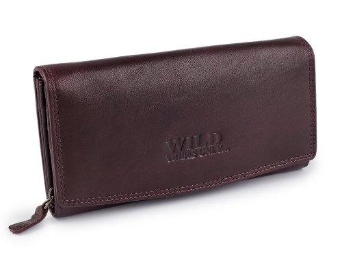 Dámská kožená peněženka má velice kvalitní provedení a chytrý design. Je velmi příjemná na dotek. Peněženka má přední stranu na klopu se zapínáním na patent. Po otevření se objeví 14 přihrádek na kreditní karty, 1 je průhledná. Za přihrádkami po pravé straně jsou 2 dlouhé přihrádky, jedna se uzavírá na zip. Po rozevření naleznete 3 velké kapsy rozdělené separací, 1 plochou kapsu a 1 kapsu na zip, sloužící jako mincovník, která je separací rozdělaná na 2 oddíly. Na zadní straně má peněženka velkou plochou kapsu a rozkládací kapsu na zip, která také může sloužit jako mincovník.