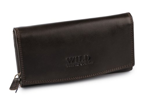 Dámská kožená peněženka má velice kvalitní provedení a chytrý design. Je velmi příjemná na dotek. Peněženka má přední stranu na klopu se zapínáním na patent. Po otevření se objeví 14 přihrádek na kreditní karty, 1 je průhledná. Za přihrádkami po pravé straně jsou 2 dlouhé přihrádky, jedna se uzavírá na zip. Po rozevření naleznete 3 velké kapsy rozdělené separací, 1 plochou kapsu a 1 kapsu na zip, sloužící jako mincovník, která je separací rozdělaná na 2 oddíly. Na zadní straně má peněženka velkou plochou kapsu a rozkládací kapsu na zip, která také může sloužit jako mincovník.