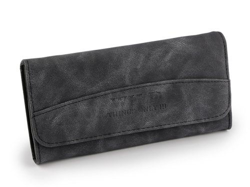 Dámská peněženka z broušené eko kůže má elegantní nadčasový design. Stane se vaší oblíbenou společnicí, snadno ji sladíte s jakýmkoliv stylem oblečení. Zavírá se na klopu a patent. Peněženka má celkem 4 přihrádky na karty, z nichž jedna je průhledná. Za ní jsou umístěné 2 dlouhé přihrádky, jedna z nich je na zip. Uprostřed peněženky se nachází 3 kapsy na bankovky, oddělené přepážkami. Vlevo je rozkládací mincovník rozdělený přepážkou na dva oddíly. Uzavírá se na zip.