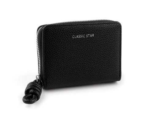 Dámská peněženka s ozdobným uzlem kombinuje stylovou eleganci a praktické využití. Na přední straně má stříbrný potisk Classic star. Peněženka má kompaktní tvar, je vyrobená z kvalitního materiálu s matným povrchem, který je příjemný na dotek. Její velikost je tak akorát do kabelky. Přední strana peněženky se zapíná na patent. Uvnitř najdete 6 přihrádek na kreditní karty, z toho 1 má průhledné okýnko. Je zde umístěná i přihrádka na bankovky. Kapsičku na mince najdete na boku peněženky, zapíná se na zip. Je separací rozdělená na 2 přihrádky.