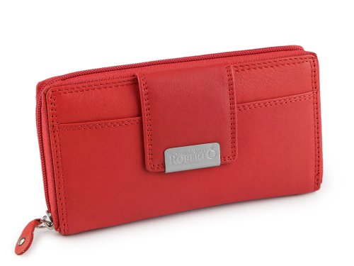 Dámská kožená peněženka má velice kvalitní provedení a chytrý design. Je velmi příjemná na dotek. Na přední straně má ozdobný detail v podopě velké zápinky. Zapíná se na zip. Uvnitř se nachází 4 přihrádky na bankovky a jedna kapsa s otvíráním na zip, sloužící jako mincovník. Uvnitř pak najdete i dostatečné množství přihrádek k uložení karet či dokladů. Na přední straně pod zápinkou je ještě jedna plochá kapsa.