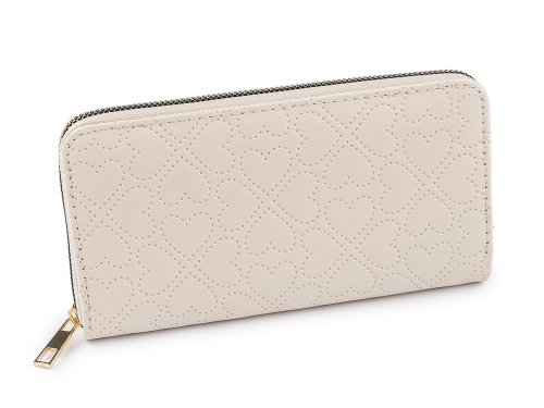 Dámská peněženka s motivem srdíček je elegantním a stylovým doplňkem, který upoutá pozornost. Peněženka obsahuje jednu hlavní kapsu, která se zapíná na kovový zip. Uvnitř je peněženka členěná do tří velkých přihrádek na papírové bankovky a jedné uzavíratelné kapsy na zip, vhodné k ukládání mincí a různých drobností. Po vnitřních stranách peněženky jsou přihrádky na karty a dvě větší na doklady, účtenky apod.