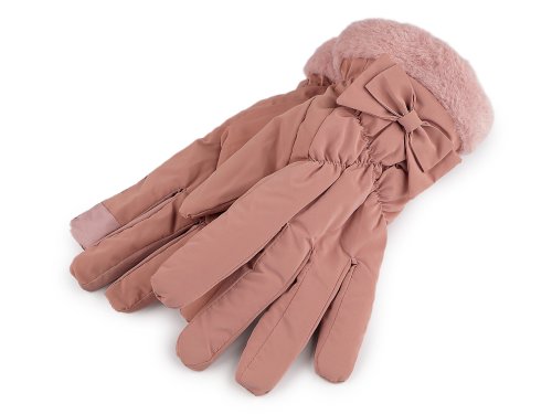 Elegantní šusťákové rukavice jsou ozdobené mašlí a lemem z umělé kožešiny.