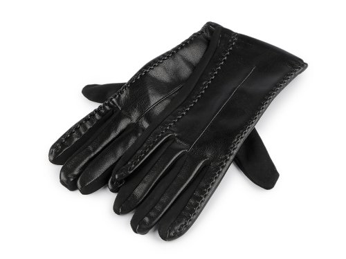 Elegantní dámské rukavice jsou na horní straně ozdobené lesklou prošívanou eko kůží. Rukavice jsou jemně pružné. Dolní strana rukavic připomíná broušenou kůži. Uvnitř mají jemný plyš, jenž je velice příjemný na dotek. Hodí se do mírné zimy nebo do chladnějšího podzimního počasí. Na ukazováčku pravé i levé ruky je vyšitý květ, díky kterému můžete ovládat dotykové přístroje - mobil, tablet, bankomat apod. Šířka je měřená na volně položených rukavicích uprostřed (bez palce).