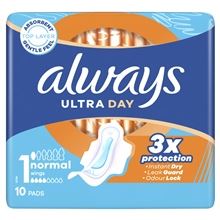 Dámské vložky Always - ultra day normal Menstruační vložky pro středně silnou menstruaci Spolehlivé a pohodlné vložky vhodné pro denní použití Díky anatomickému tvaru a praktickým křidélkům perfektně …